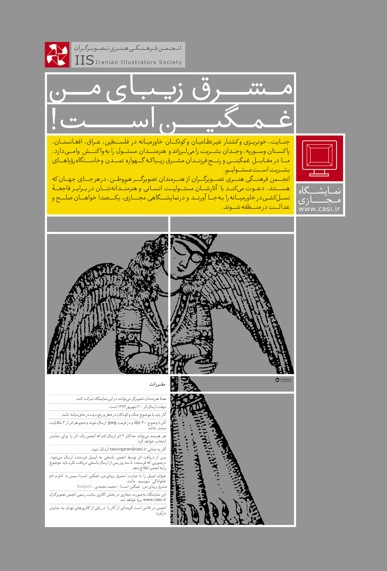 ۱۳۹۳/۰۵/۲۵جنایت و خونریزی و کشتار غیرنظامیان و کودکان خاورمیانه در افغانستان، پاکستان، عراق، سوریه و از همه دردناکتر، فلسطین، وجدان بشریت را میلرزاند و هنرمندان مسئول را به واکنش وامیدارد. ما در مقابل غمگینی فرزندان مشرق زیبا که گهواره تمدن و خاستگاه رؤیاهای بشریت است، مسئولیم. انجمن فرهنگی- هنری تصویرگران از تصویرگران هموطن ــ در هر جای جهان که هستند ــ دعوت میکند با آثارشان، مسئولیت انسانی و هنرمندانهشان در برابر فاجعۀ نسلکشی در غزه و خاورمیانه را بهجا آورند و در نمایشگاهی مجازی، یکصدا خواهان صلح و عدالت در منطقه شوند.