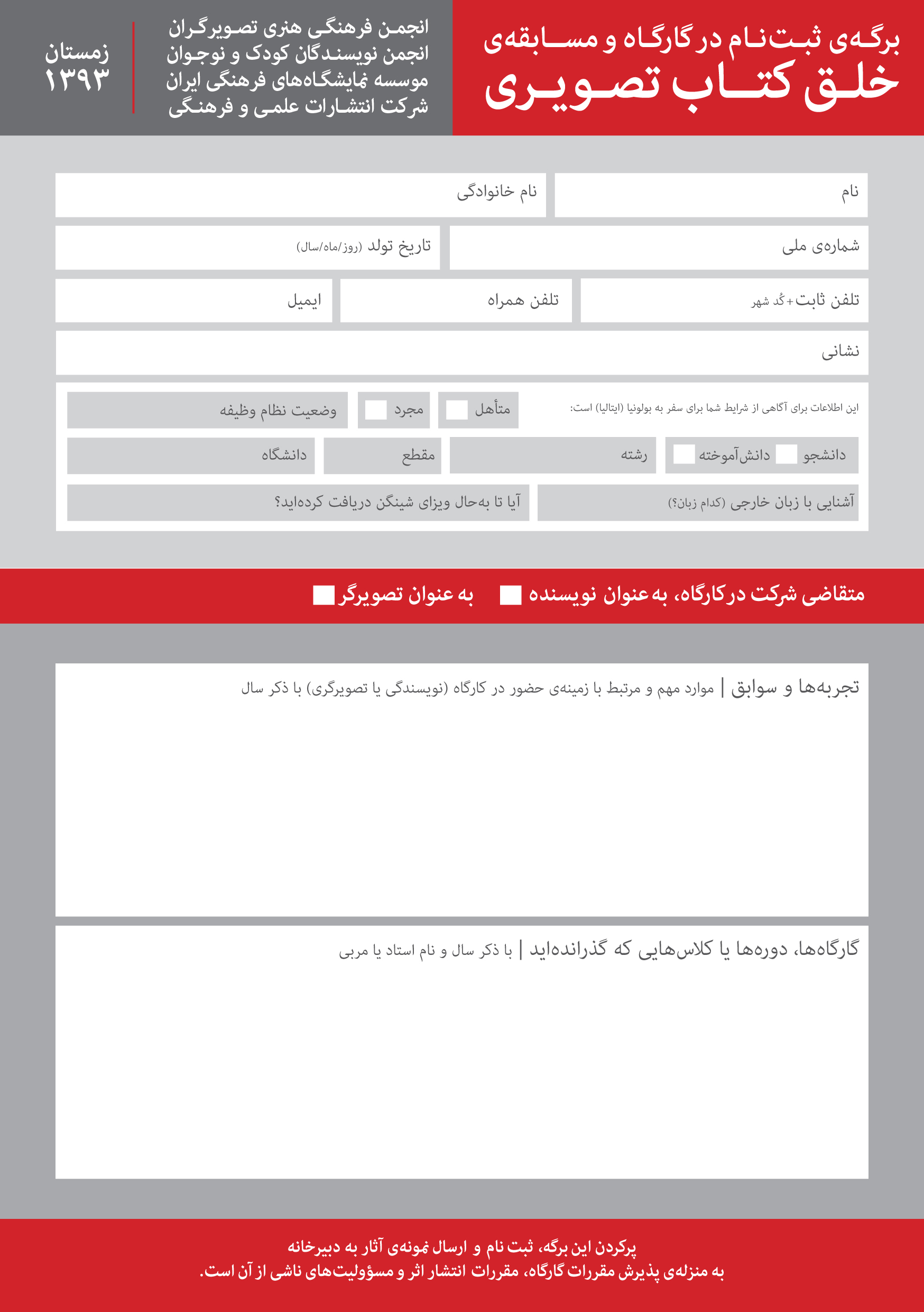 ۴ . ارسال فرم پر شده به همراه یک نمونه کار برای کودک (داستان یا تصویرگری ) به نشانی ایمیل: